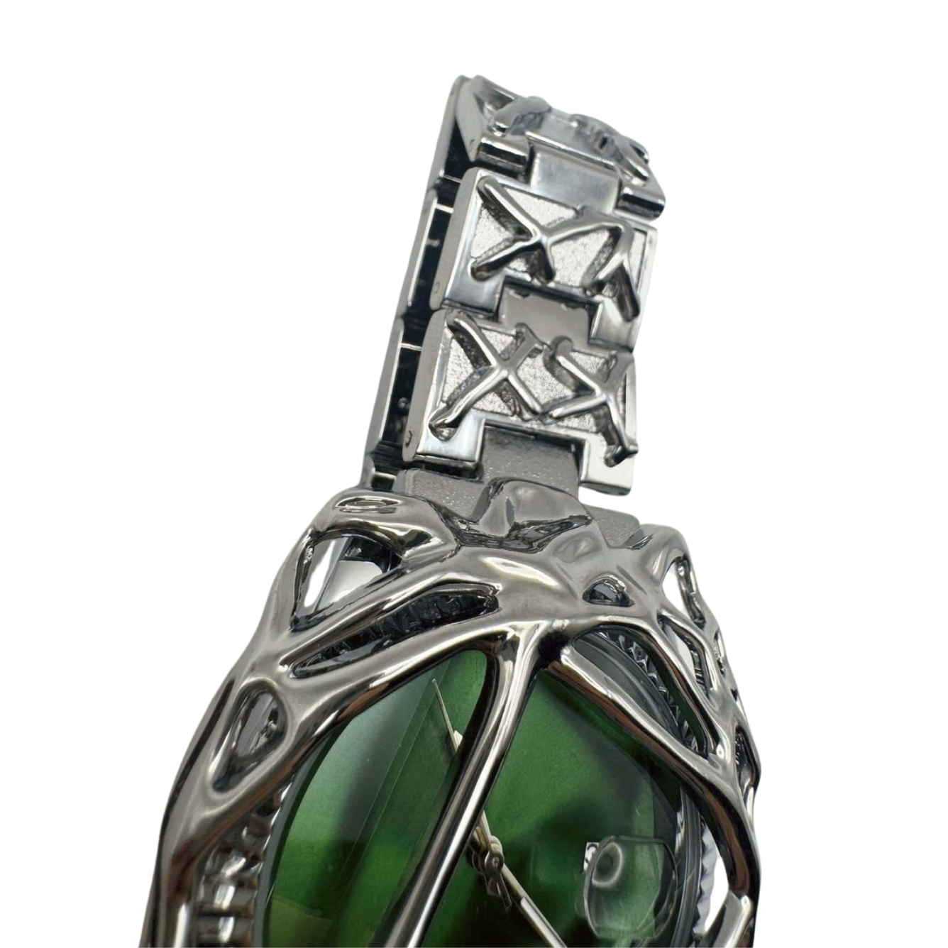 Emerald Skeleton Cyber Watch, built from durable stainless steel that won’t tarnish or fade. Its cyber-inspired emerald accents and open skeleton dial create a bold futuristic vibe that hits with unmistakable modern-grunge attitude.