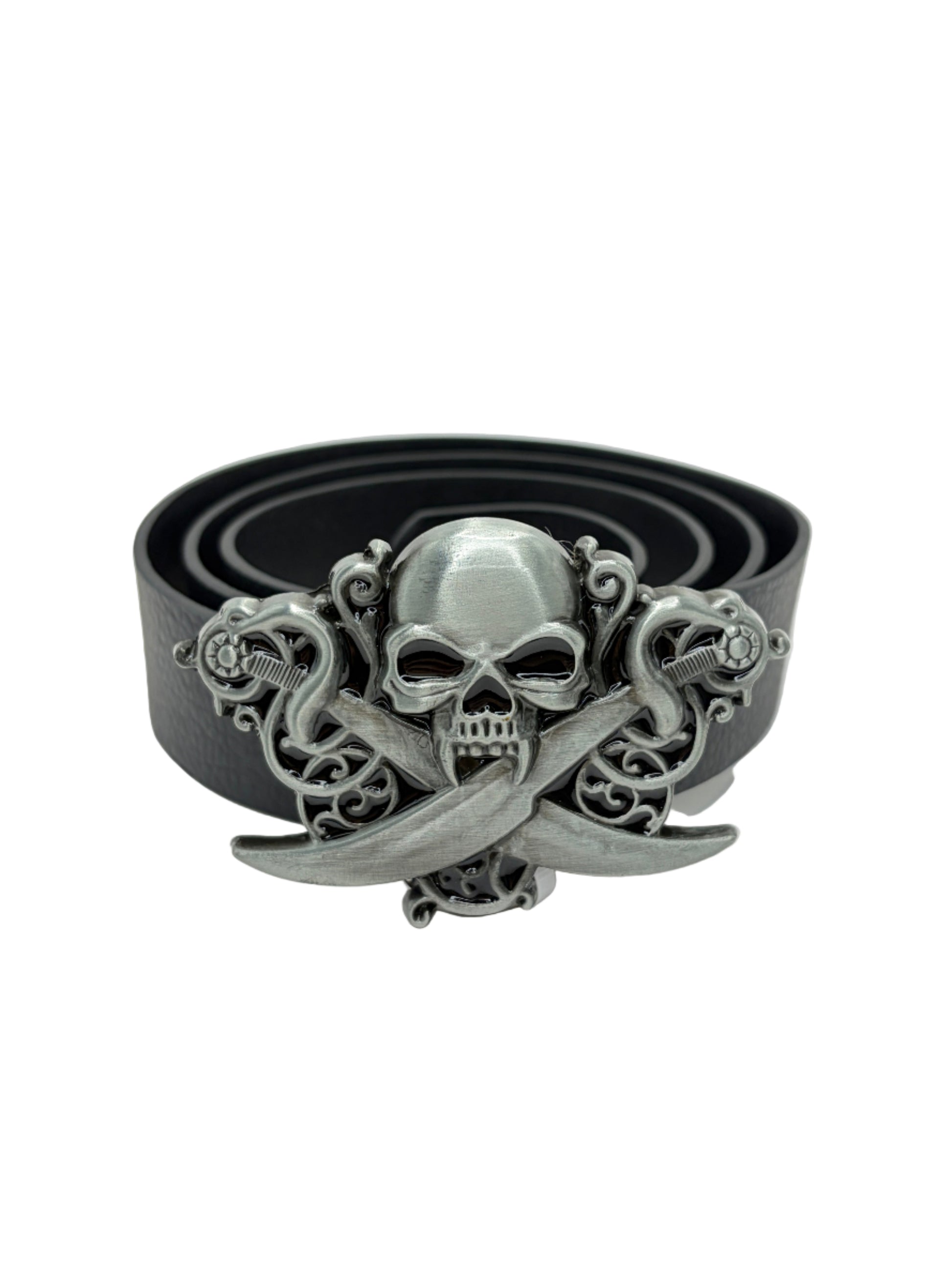• Style: Silver skull sword buckle with black belt