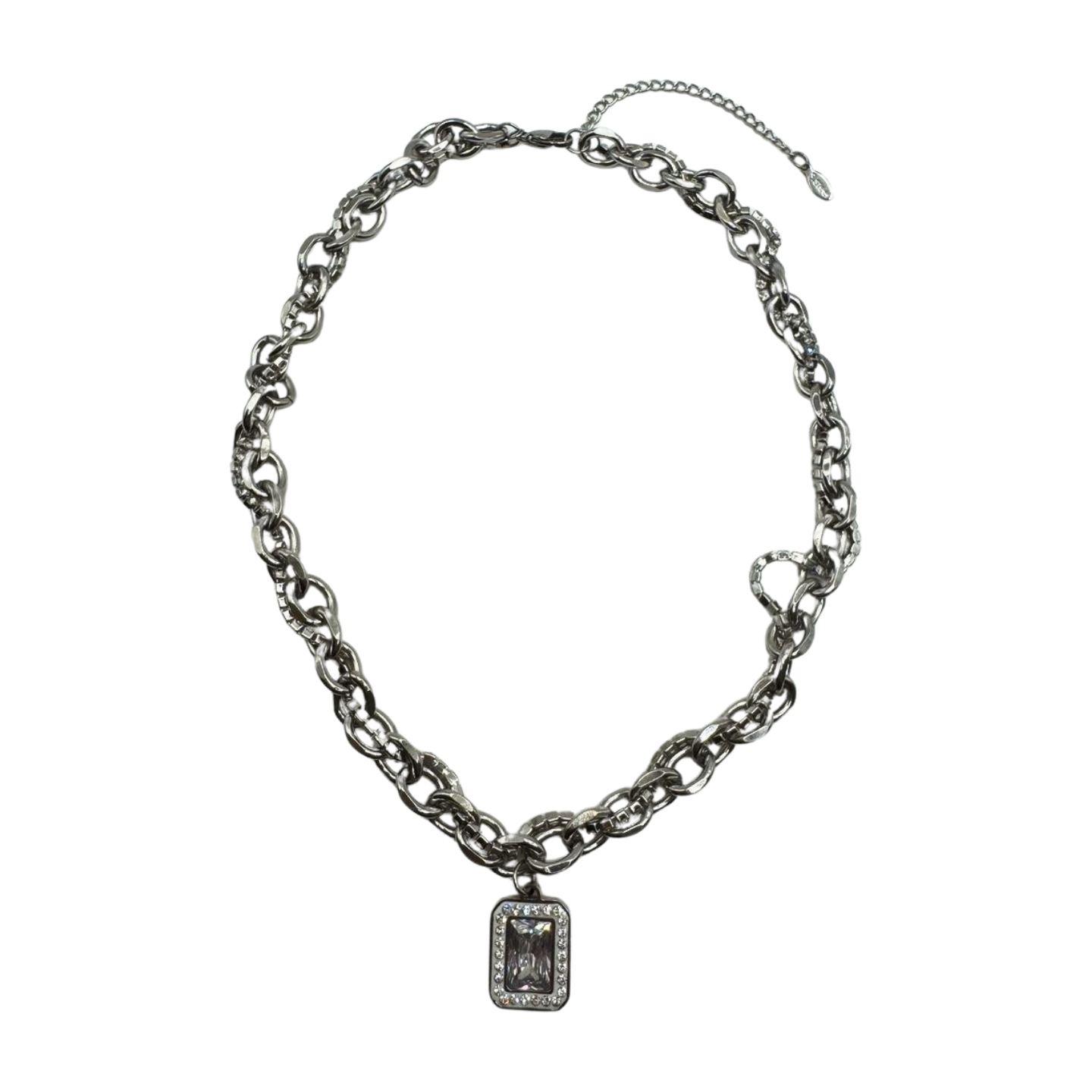 Silver Crystal Double Chain brings a sleek, reflective shine with a layered design that instantly elevates your look. Its bold shimmering rectangular crystal pendant, paired with a 6mm Cuban dual-chain structure create a modern-grunge shimmer that stands out effortlessly. Durable and stylish, it adds a sharp, eye-catching finish to any outfit.