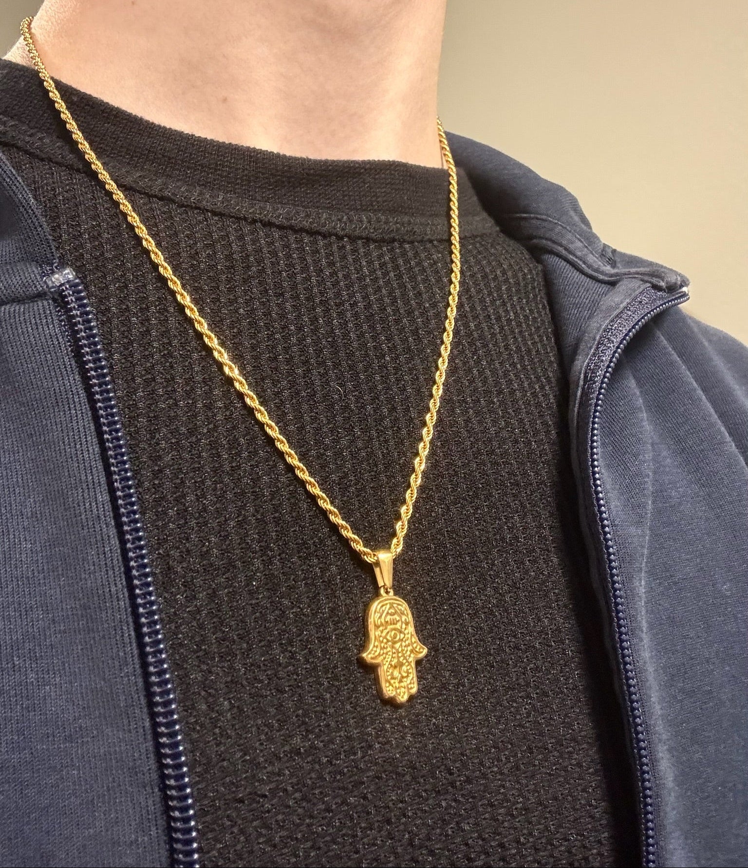 Gold Eye of Hamsa Necklace brings a protective, symbolic presence with its polished, tarnish-resistant stainless-steel design. The detailed Hamsa hand features the iconic eye motif, hanging from a 20-inch rope chain for a clean blend of shine and meaning. Finished with a sturdy lobster clasp, it’s built for everyday wear and adds subtle spiritual energy to any fit.