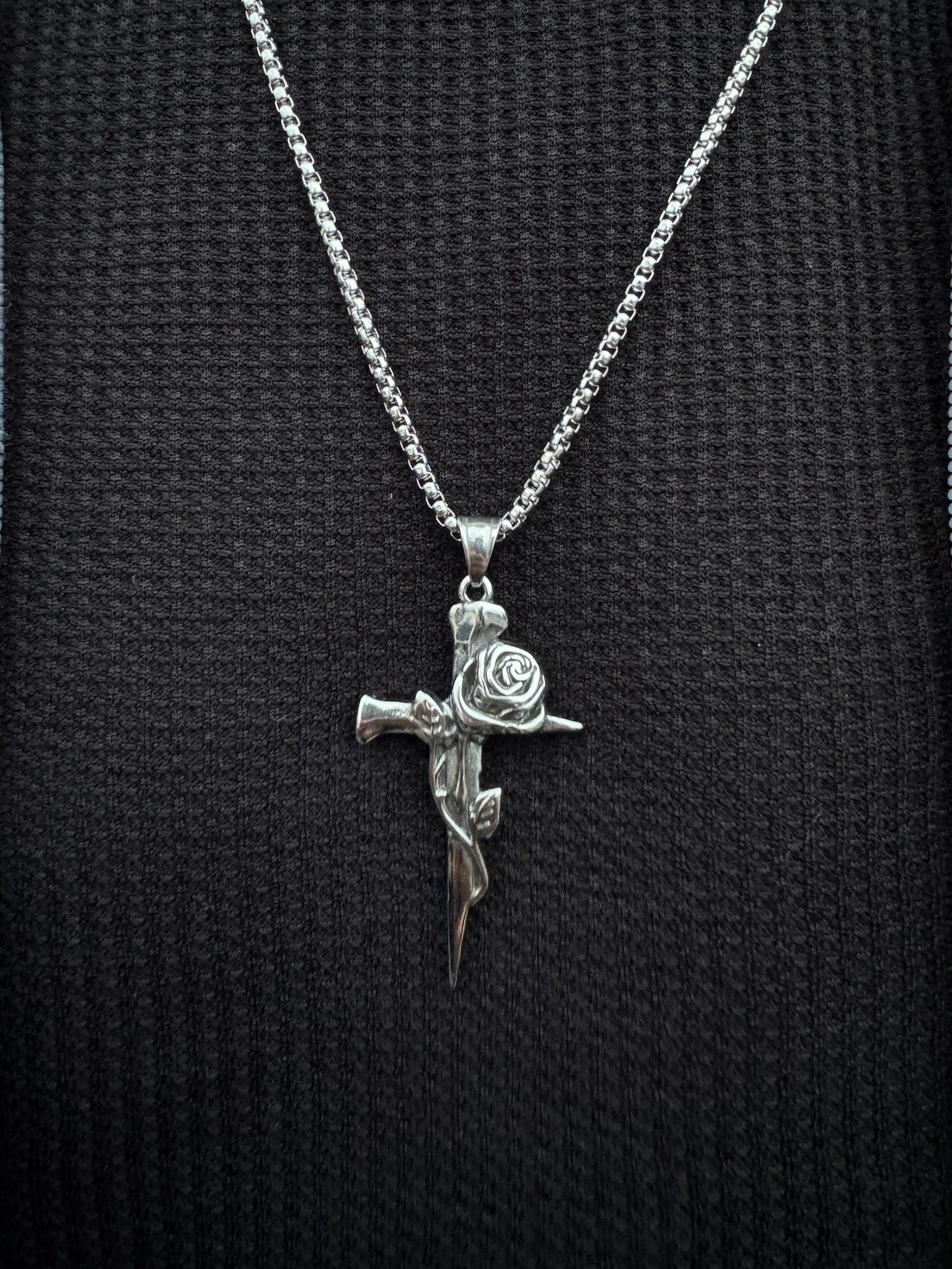Silver Rose Cross pendant on a 20-inch box chain delivers a refined, symbolic look with clean detail and a modern edge. Made from waterproof, tarnish-resistant materials to maintain long-lasting shine and durability.